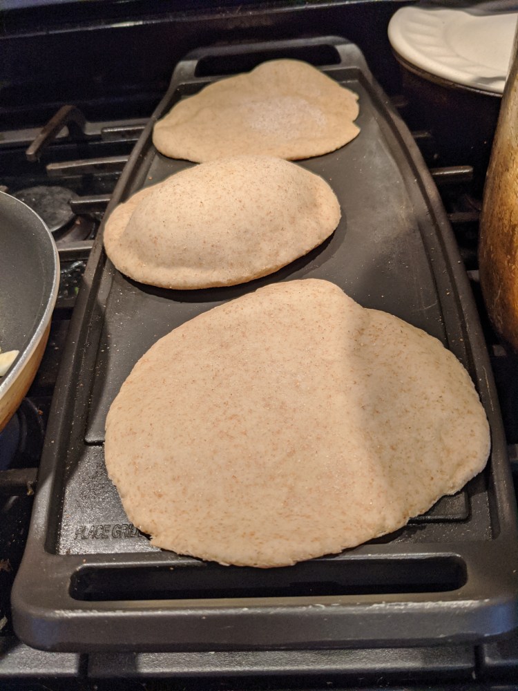 Batbout is a Berber pita-like bread and this recipe was accurate and easy. I used 2 cups barley flour, 2 cups white, and 2 cups wheat. After the batbout was cooked and while still hot I brushed them with 50:50 olive oil:balsamic and sprinkled with zaatar.