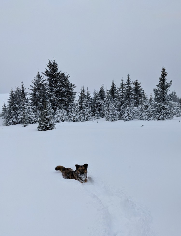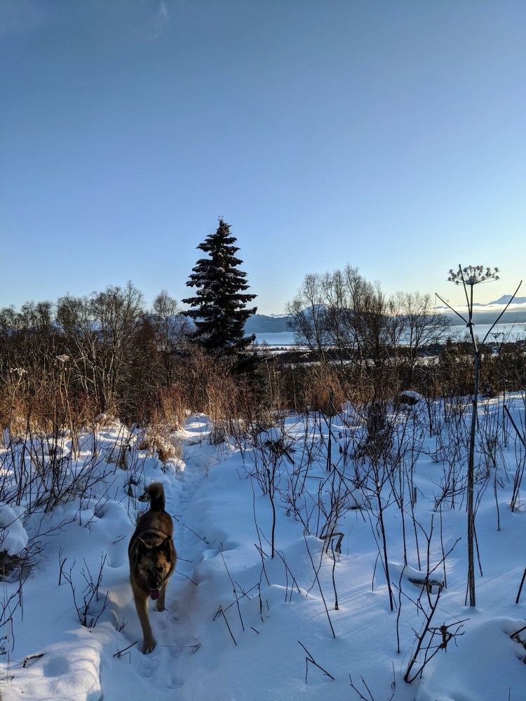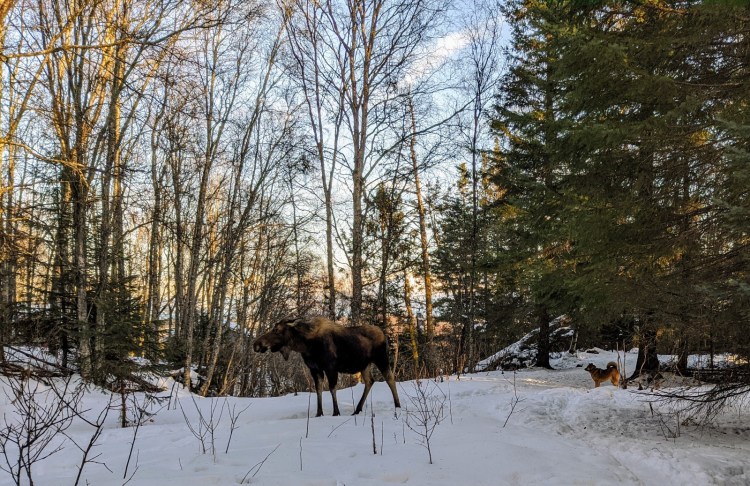 Trails is very good with her moose neighbors, the other day she walked right past this one. What a good girl!