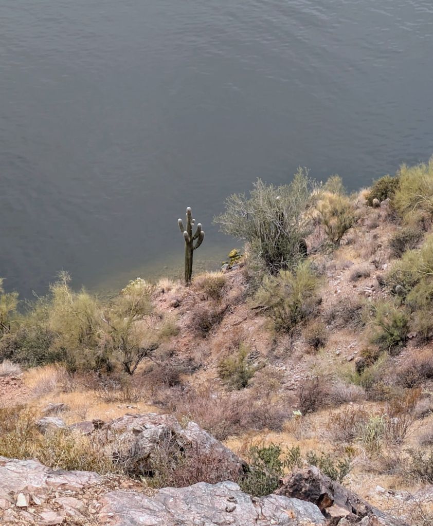 About two miles in, the trail rises, opening up to a wide view of the lake. From here, itโs easy to see how the water carves into the desert, creating hidden coves and inlets. I spotted a birds nest in a cactus just off the trail.