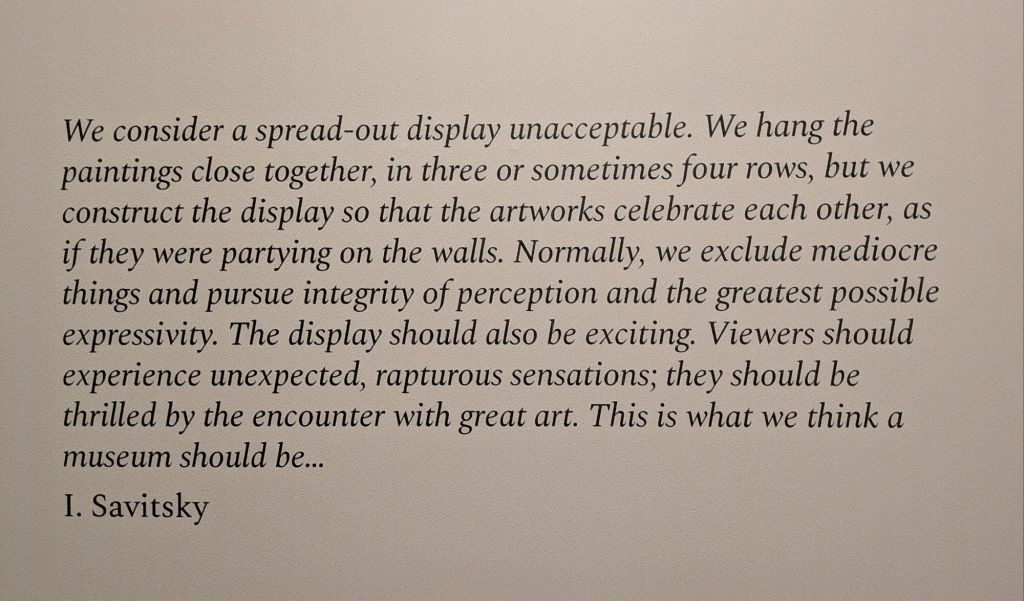 While Savitsky isn’t considered a great artist, I think his artistry is in curation and exhibition. For example his words about how he prefers to display art: